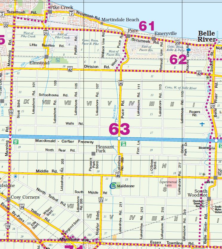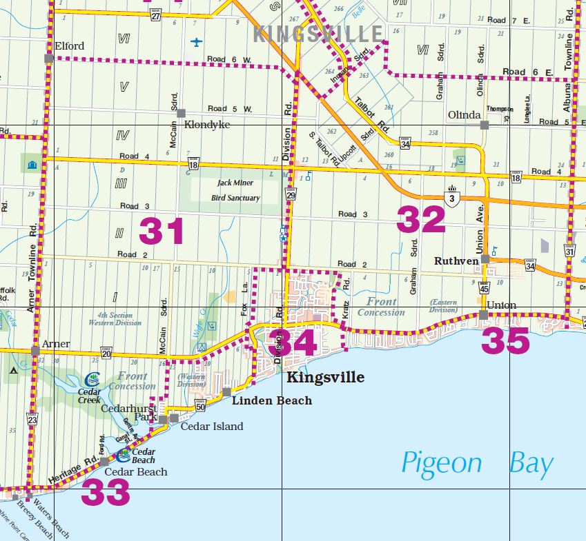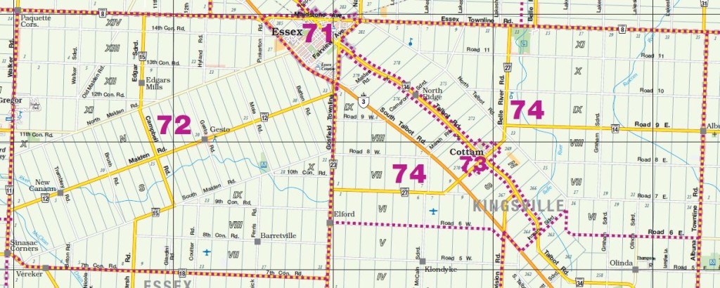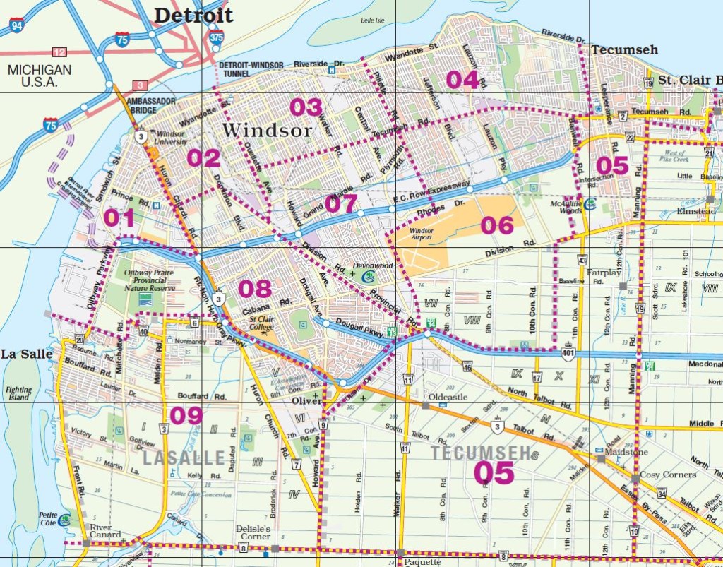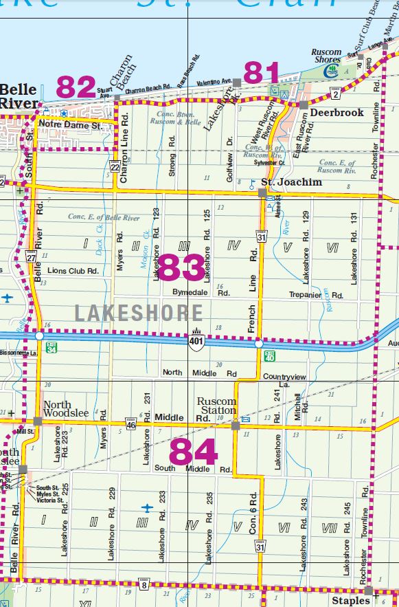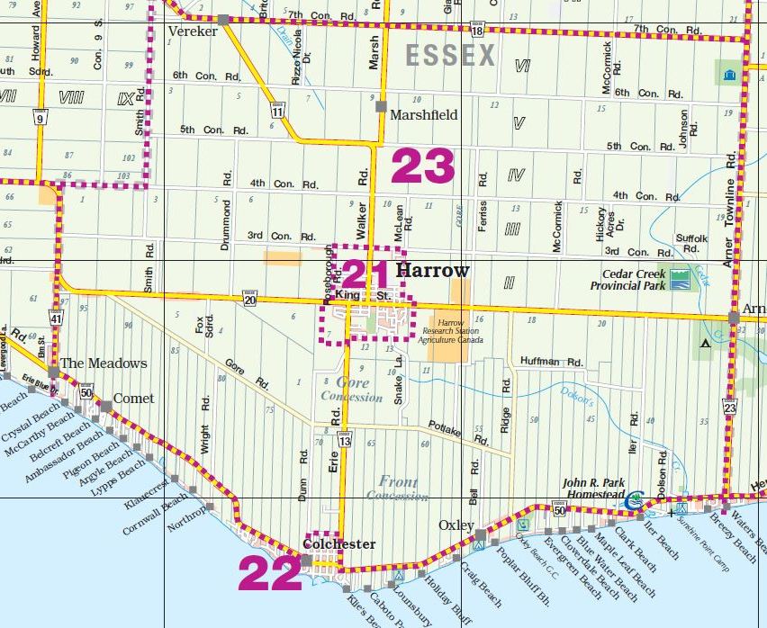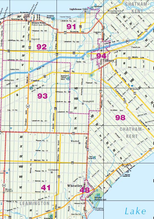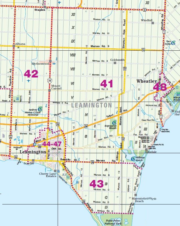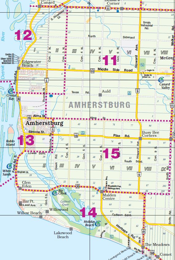 District: 00 - Windsor, Lasalle, Tecumseh Sub-District – Click map for larger view1 – West Windsor2 – Downtown/West Windsor3 – Central Windsor/Downtown4 – East Windsor5 – Tecumseh6 – Fountainbleu/Forest Glade7 – South Central8 – South Windsor9 – LaSalle District: 10 - Amherstburg Sub-District – Click map for larger view11 – McGregor/Anderdon12 – Waterfront/Anderdon13 – Amherstburg14 – Malden South15 – Malden Centre District: 20 - Essex Sub-District – Click map for larger view21 – Harrow22 – Colchester/Oxley23 – Colchester South District: 30 - Kingsville Sub-District – Click map for larger view31 – Gosfield South/Arner32 – Gosfield South/Ruthven33 – Cedar Beach/Linden Beach34 – Kingsville35 – Gosfield South/Seacliff District: 40 - Leamington Sub-District – Click map for larger view41 – Mersea/Blytheswood42 – Mersea/Albuna/Erie43 – Mersea/Point Pelee44 – Northeast Leamington45 – Northwest Leamington46 – Southwest Leamington47 – Southeast Leamington/Robson49 – Pelee Island District: 50 - Wheatley Sub-District – Click map for larger view48 – Wheatley98 – Outside Board Jurisdiction District: 70 - Essex, Kingsville Sub-District – Click map for larger view71 – Essex72 – Colchester North/Gesto/Paquette/McGregor73 – Cottam/North Ridge74 – Gosfield North District: 60 - Lakeshore Sub-District – Click map for larger view61 – Amy Croft/Russell Woods/Orchard Park62 – Monarch Meadows/Heritage Garden/Willowwood63 – Maidstone Central/Pleasant Park District: 80 - Lakeshore Sub-District – Click map for larger view81 – Rochester/Deerbrook82 – Belle River83 – Rochester/St.Joachim84 – Woodslee District: 90 - Lakeshore/Outside Sub-District – Click map for larger view91 – Tilbury North/Lighthouse Cove/Stoney Point92 – Tilbury North93 – Tilbury West/Comber/Staples94 – Tilbury98 – Outside Board Jurisdiction