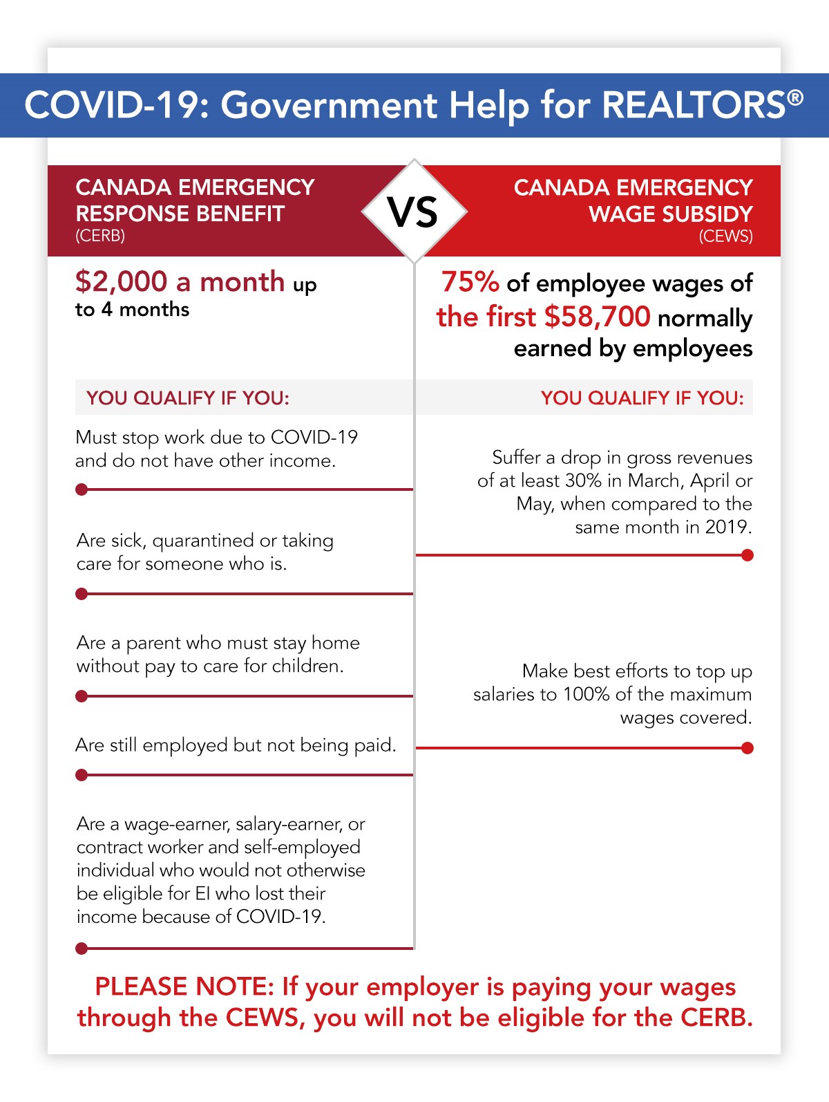 In response to our calls for significant action, the federal government has responded with the Canada Emergency Response Benefit (CERB) and the Canada Emergency Wage Subsidy (CEWS):