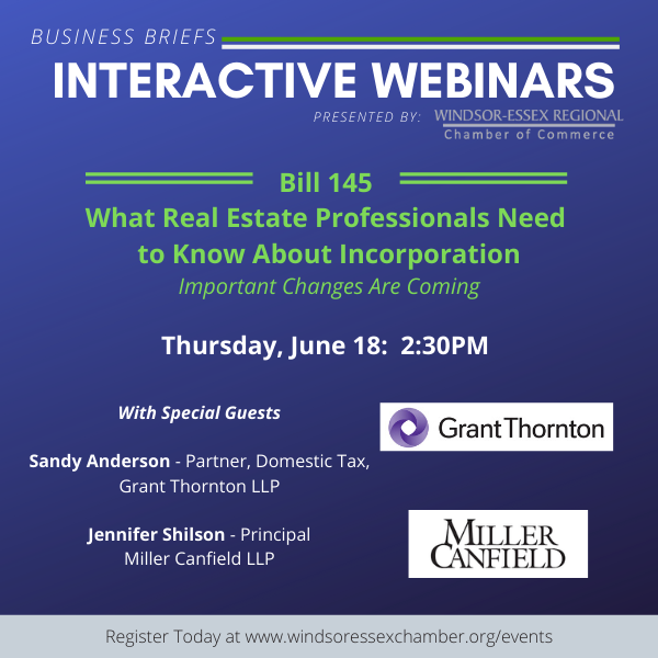 THE WINDSOR- ESSEX REGIONAL CHAMBER OF COMMERCE is hosting a free webinar: BILL 145: What Real Estate Professionals Need to Know About Incorporation in partnership with Grant Thornton LLP and Miller Canfield LLP , on Thursday June 18th at 2:30 pm
